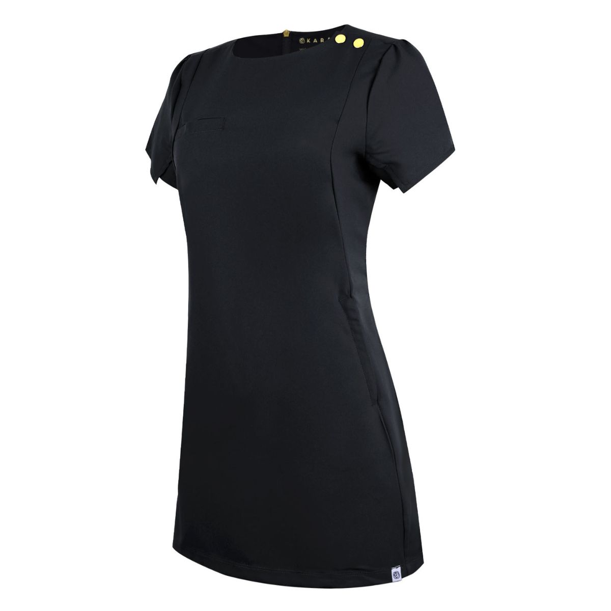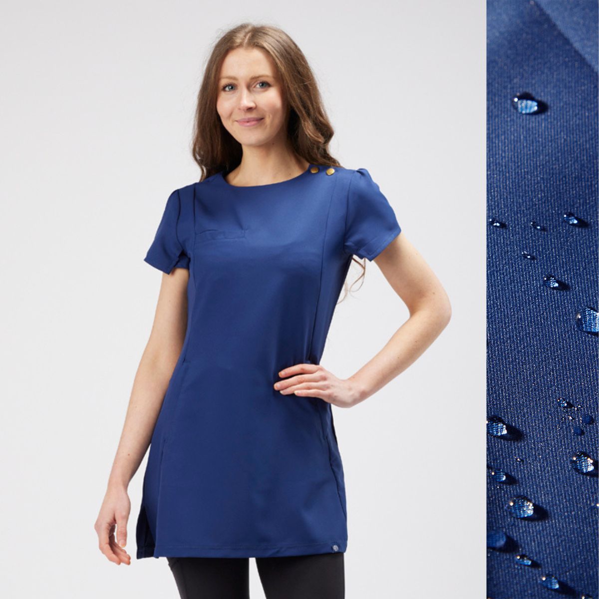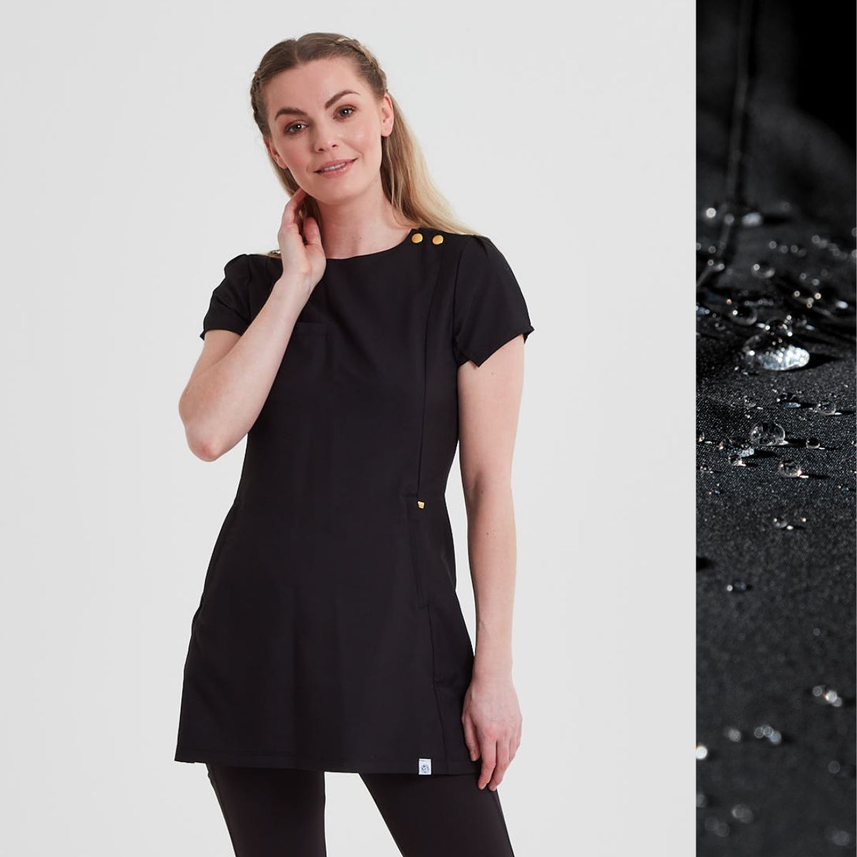 The Vita Tunic has a clean, round neckline and features bold feature gold snaps on one shoulder. The layered beauty tunic sleeve design provides luxurious freedom of movement in this elegant salon tunic. The Vita Tunic is shaped to be fitted at the waist, featuring one chest pocket & two lower zipped pockets. The gold trims on the central long back zip and the two side pocket zips add a flash of glamour to your working wardrobe. Also, the hem side vents enable a greater degree of movement, useful for those days which don’t let you off your feet! Especially, you’ll feel professional when you wear the Edit beauty tunic with our super comfortable, form-fitting Kara leggings to complete the perfect look.